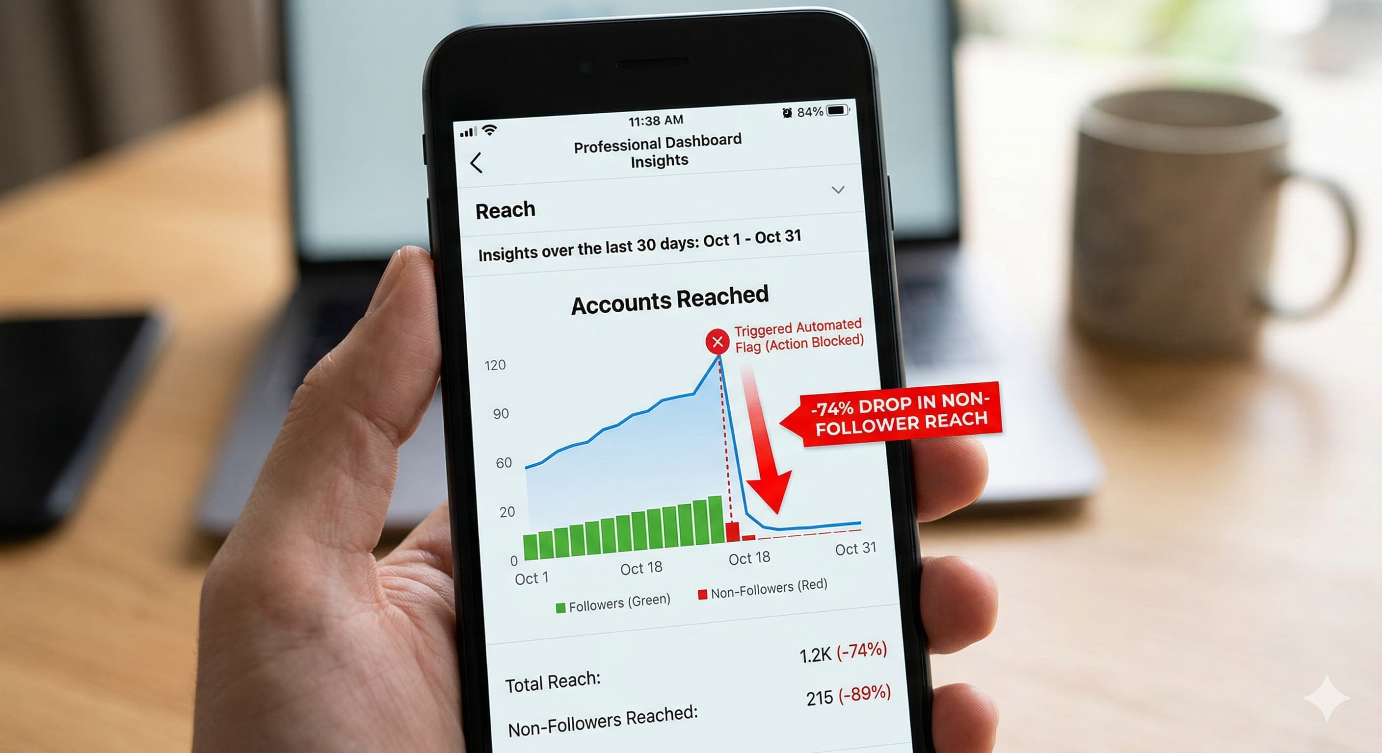 "To give you an idea of the damage, here is a snapshot of my professional dashboard during that 'blocked' phase. You’ll notice the sharp 74% drop in non-follower reach the moment I triggered the automated flag. This wasn't just a dip; it was a total halt in discovery."