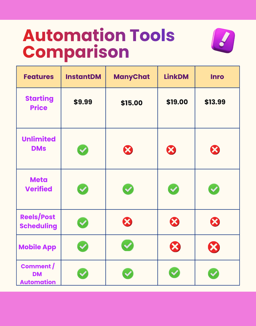 Feature | InstantDM | ManyChat | LinkDM | Inrō | ReplyRush |